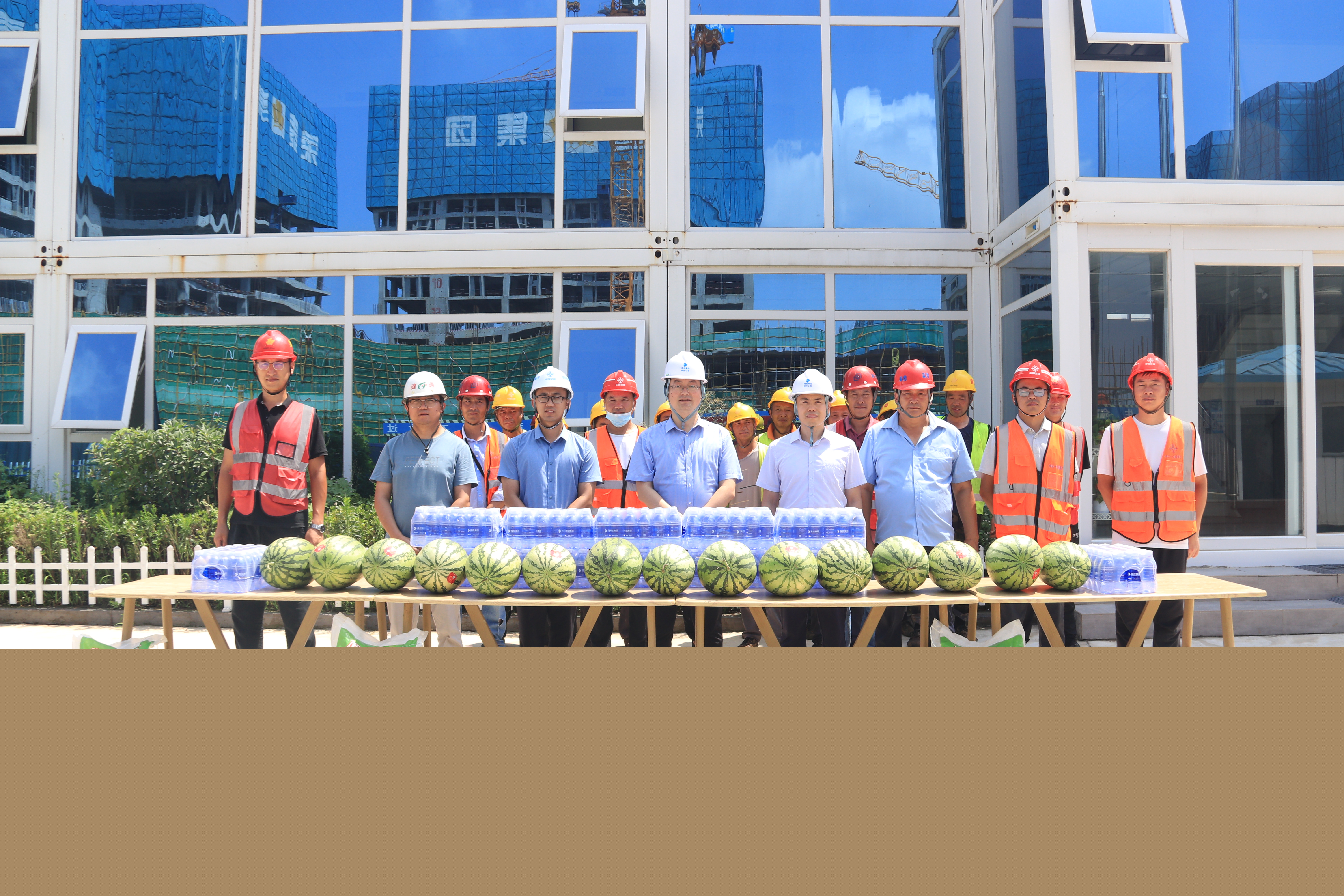在炎炎烈日下,工人們?nèi)悦爸崾钚燎诘膭趧樱袟l不紊的推動項目建設。海控集團創(chuàng)投公司協(xié)同黨建與綜合部為現(xiàn)場工人送上綠豆、礦泉水、西瓜等防暑物資,并叮囑大家合理安排作息時間、創(chuàng)造良好的工作環(huán)境,切實做好防暑降溫,確保生產(chǎn)作業(yè)安全、健康、高效。
