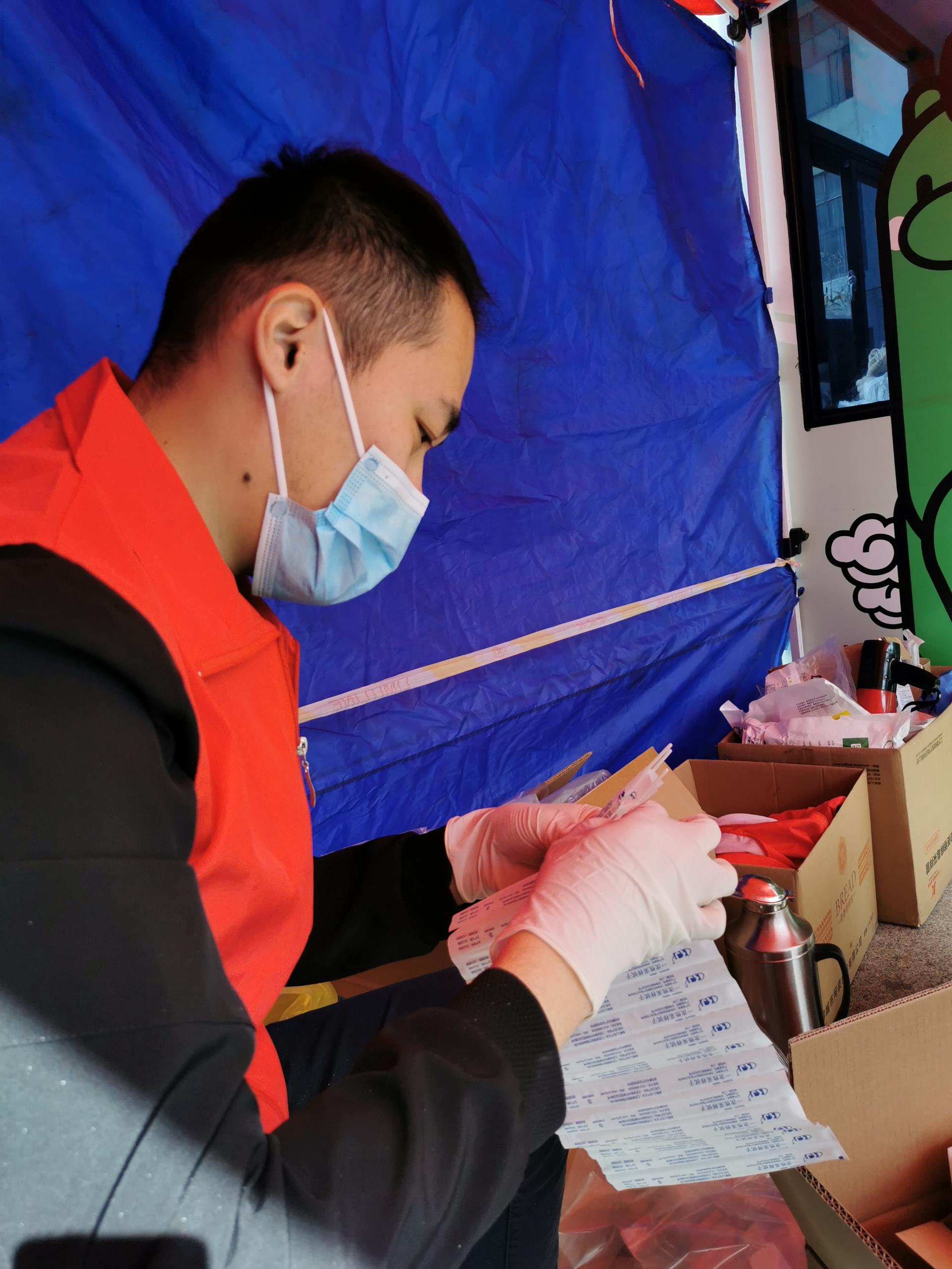 在薛家島街道青云山路社區服務的黨員孫建強,沖在一線、干在一線,協助社區開展核酸檢測工作。據孫建強介紹,他負責一次性檢測棒的拆裝工作,拆開檢測棒,交給采樣工作人員。一邊拆,一邊監測,流水線作業,提高檢測效率。這樣一項看上去很簡單的工作,孫建強一做就是兩三個小時。