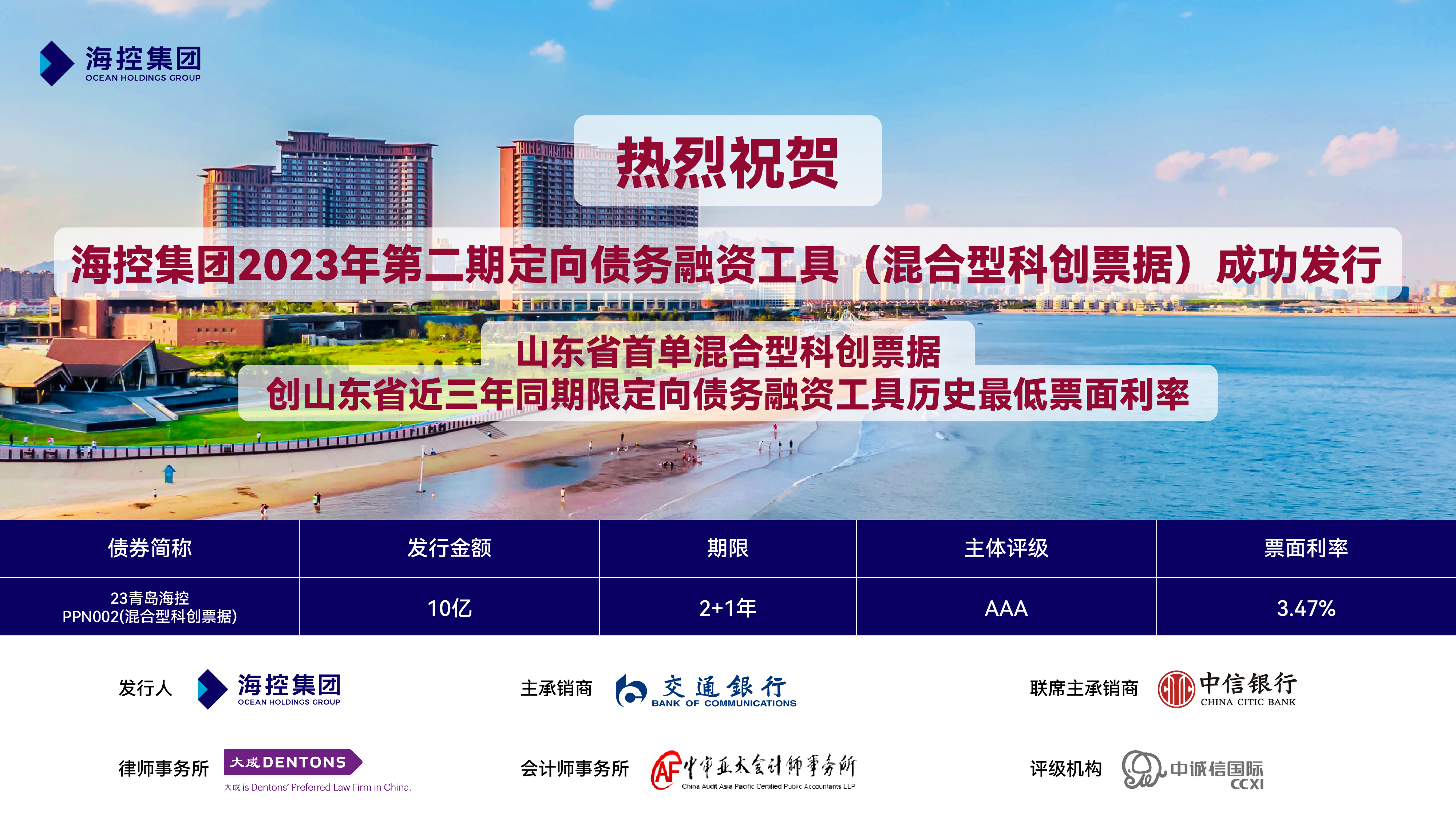 近日,海控集團(tuán)“2023年度第二期定向債務(wù)融資工具(混合型科創(chuàng)票據(jù))”成功發(fā)行,為山東省首單混合型科創(chuàng)票據(jù),發(fā)行金額10億元,期限為2+1年,票面利率3.47%,創(chuàng)山東省近三年同期限定向債務(wù)融資工具歷史最低票面利率。